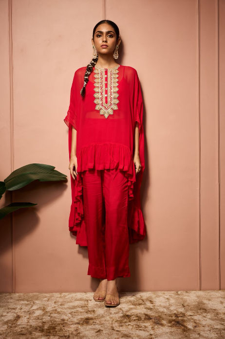 RED EMBROIDERED KURTASET WITH CONCEPT DUPATTA.