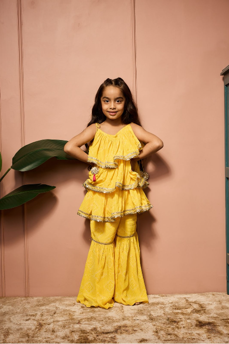 HALDI BANDHEJ TIERED SHARARASET.