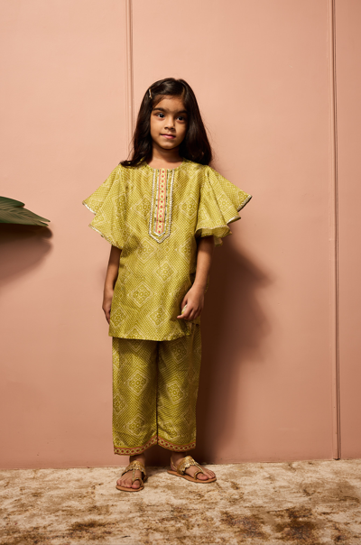 MEHENDI GREEN BANDHEJ FLUTTER SLEEVS CO-ORDSET.