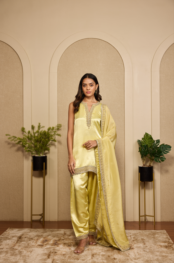 Lime bead embroidered kurtaset with embroidered dupatta.