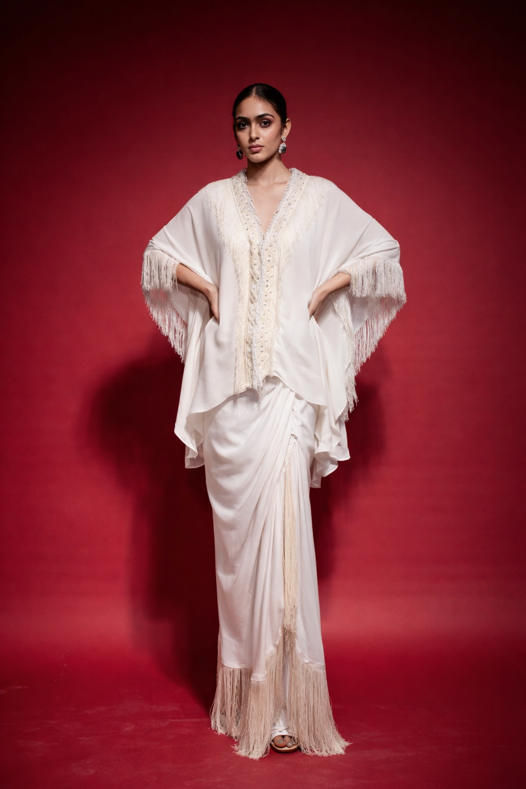 IVORY FRINGE EMBROIDERED KAFTANSET .