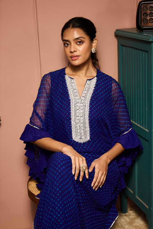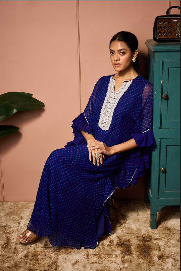Blue leheriya long kaftan with bead embroidered yoke and ruffle detailing.